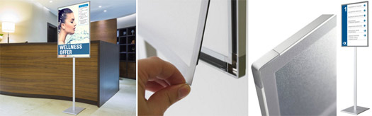 Das freistehende Bodendisplay magnofloor präsentiert vor dem Restaurant die Speisekarte, macht an der Rezeption auf wichtige Informationen aufmerksam, begrüßt inargäste oder ...